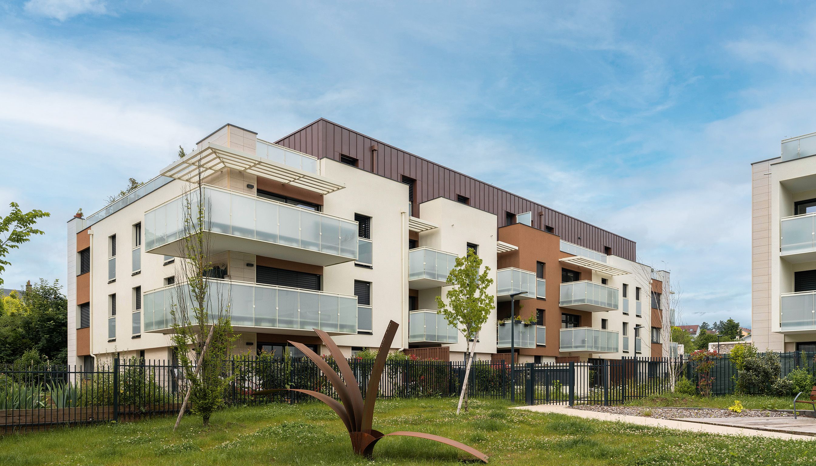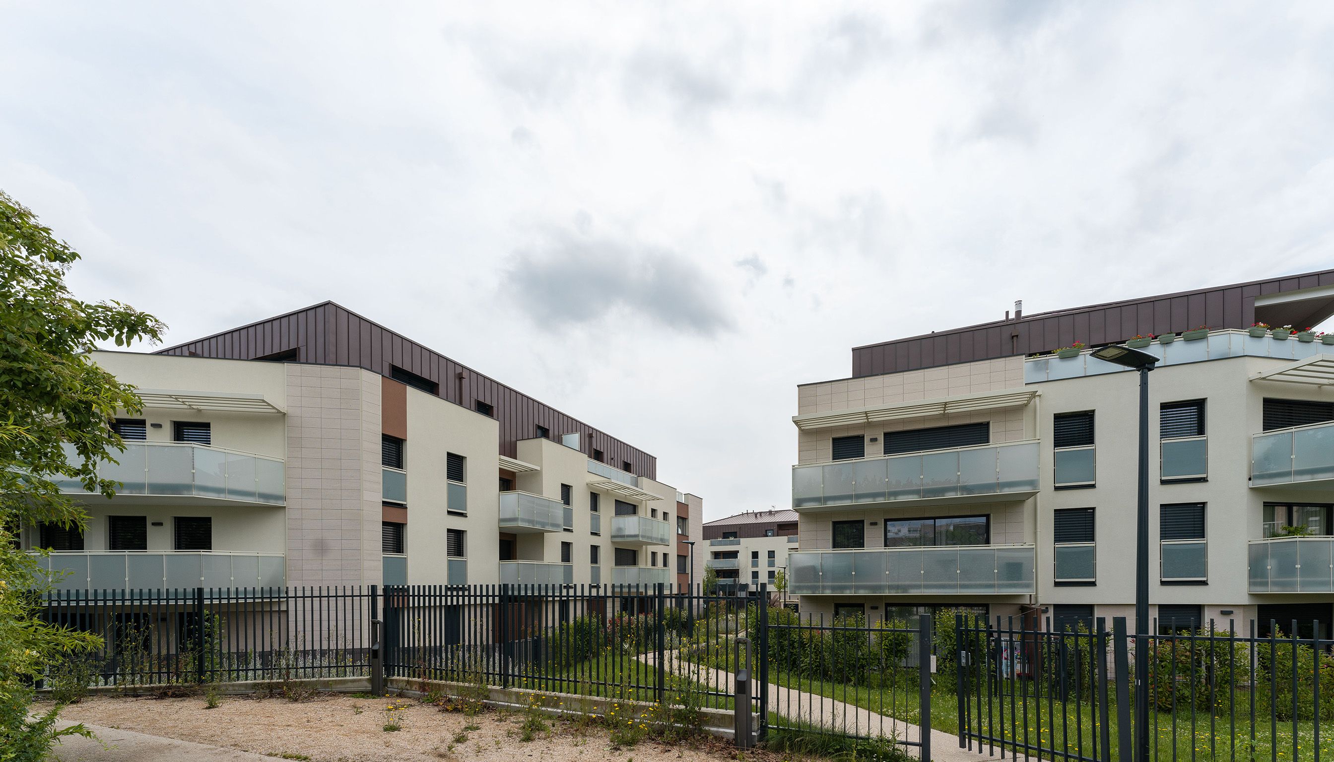 Quatre bâtiments sont implantés de manière à favoriser les espaces d’échanges et offrent de belles orientations aux logements. Nous avons travaillé des volumes simples et lisibles avec des ordonnancements de baies vitrées très cadrés et un travail précis sur le choix des matériaux.